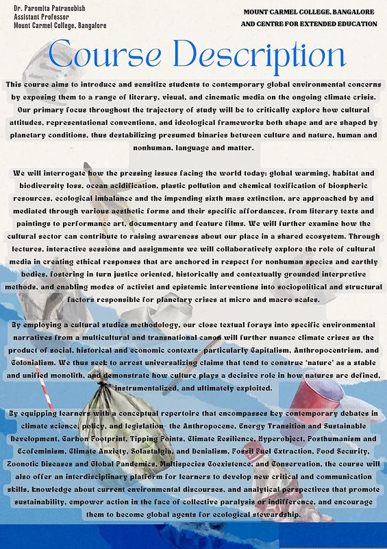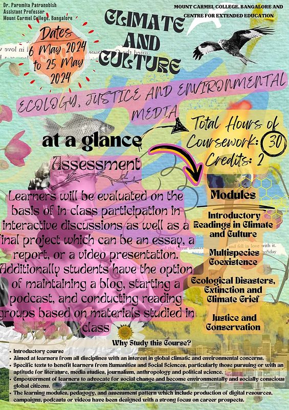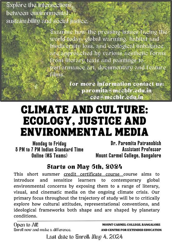 This short term credit certificate course under the aegis of the Centre for Extended Education, Mount Carmel College, Bangalore, India, is designed to benefit both beginners and advanced learners. It addresses several key issues of our times, exploring the intersections between representation, mediation, and materiality in determining the shape of contemporary ecological crises.